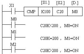 ( 1 )比较指令CMP (D)CMP(P)指令的编号为FNC10 ,是将源操作数[S1.]和源操作数[S2.]的数据进行比较,比较结果用目标元件[D.]的状态来表示。如图1所示,当X1为接通时,把常数100与C20的当前值进行比较,比较的结果送入M0 ~ M2中。X1为OFF时不执行, MO ~ M2的状态也保持不变。
