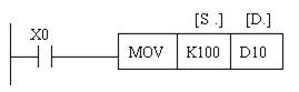 ( 1 )传送指令MOV (D)MOV(P)指令的编号为FNC12 ,该指令的功能是将源数据传送到指定的目标。如图3所示,当X0为ON时,则将[S.]中的数据K100传送到目标操作元件[D.]即D10中。在指令执行时, 常数K100会自动转换成二进制数。当X0为OFF时,则指令不执行,数据保持不变。