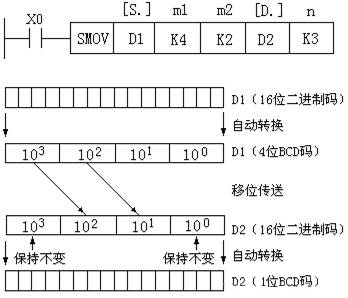 (2 )移位传送指令SMOV SMOV(P)指令的编号为FNC13。该指令的功能是将源数据(二进制)自动转换成4位BCD码,再进行移位传送,传送后的目标操作数元件的BCD码自动转换成二进制数。如图4所示,当X1为ON时,将D1中右起第4位( m1=4 )开始的2位(m2=2) BCD码移到目标操作数D2的右起第3位(n= 3)和第2位。然后D2中的BCD码会自动转换为二进制数,而D2中的第1位和第4位BCD码不变。