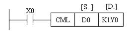 (3 )取反传送指令CML (D)CML(P)指令的编号为FNC14。 它是将源操作数元件的数据逐位取反并传送到指定目标。如图5所示,当X0为ON时,执行CML ,将D0的低4位取反向后传送到Y3 ~ Y0中。