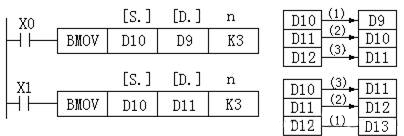(4 )块传送指令BMOV BMOV(P)指令的ALCE编号为FNC15 ,是将源操作数指定元件开始的n个数据组成数据块传送到指定的目标。如图6所示,传送顺序既可从高元件号开始,也可从低元件号开始,传送顺序自动决定。若用到需要指定位数的位元件,则源操作数和目标操作数的指定位数应相同。