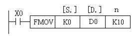 (5 )多点传送指令FMOV (D)FMOV(P)指令的编号为FNC16。 它的功能是将源操作数中的数据传送到指定目标开始的n个元件中,传送后n个元件中的数据完全相同。如图7所示,当X0为ON时,把K0传送到D0 ~ D9中。
